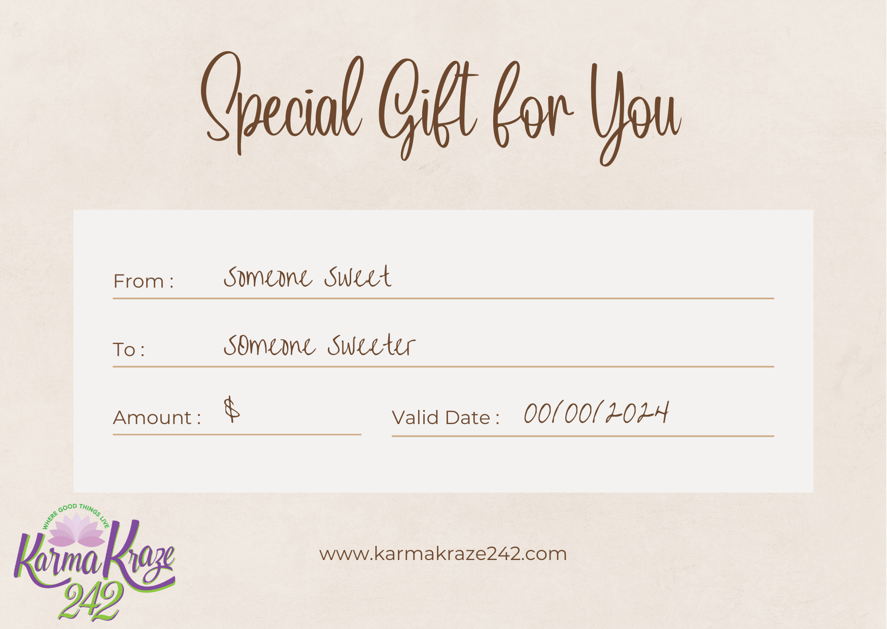 You're thought of as special by someone. Use this gift card to purchase whatever you wish and do enjoy. Should you have any questions about any of the products please feel free to reach out to us via email :karmakraze242@gmail.com or contacting (242)478-4208